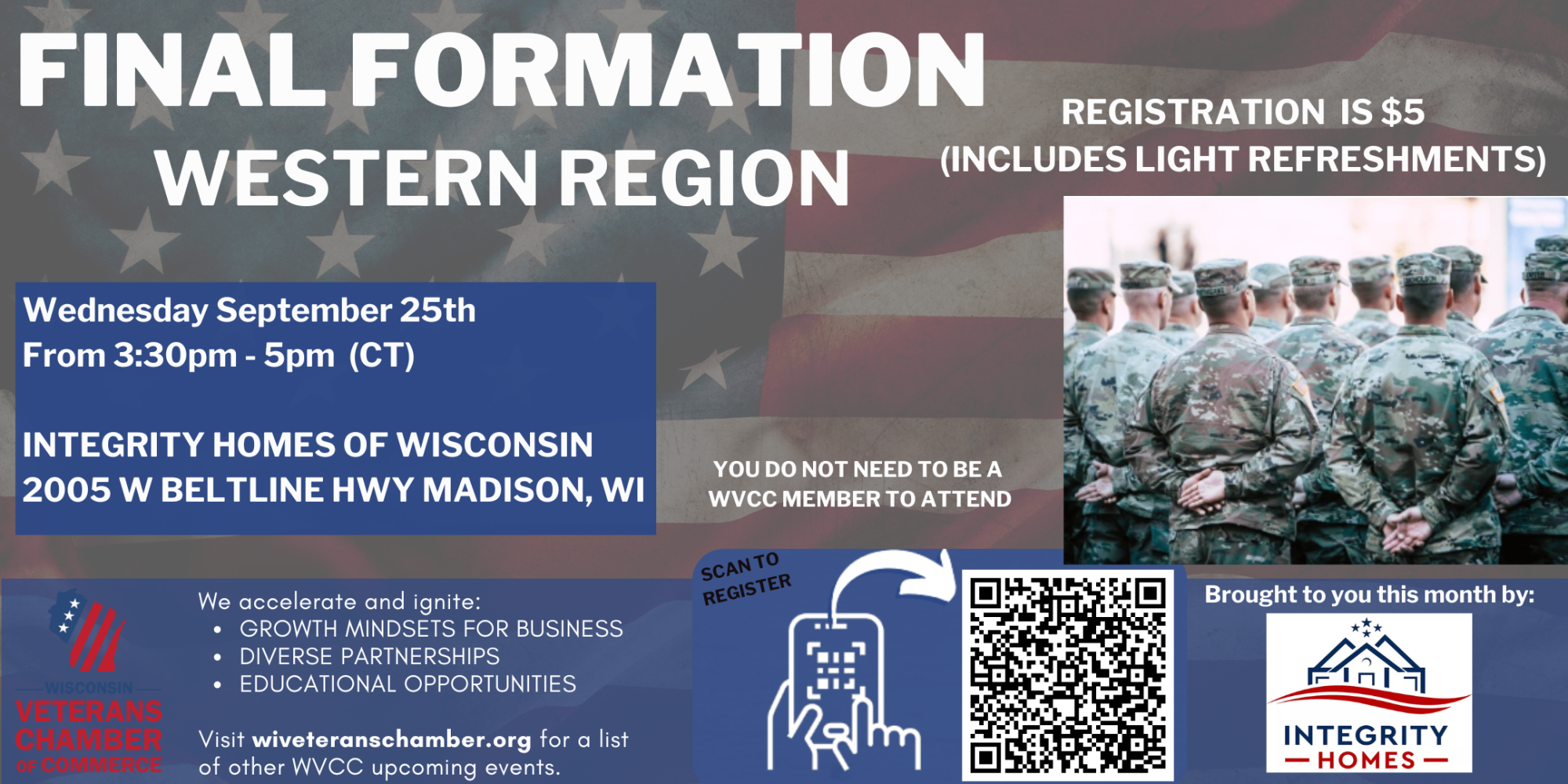 WVCC is proud to provide an afternoon networking event hosted monthly by our WVCC members. FINAL FORMATION augments those with busy business daytime calendars and gives access to those that prefer after business hours gathering to make networking more viable.