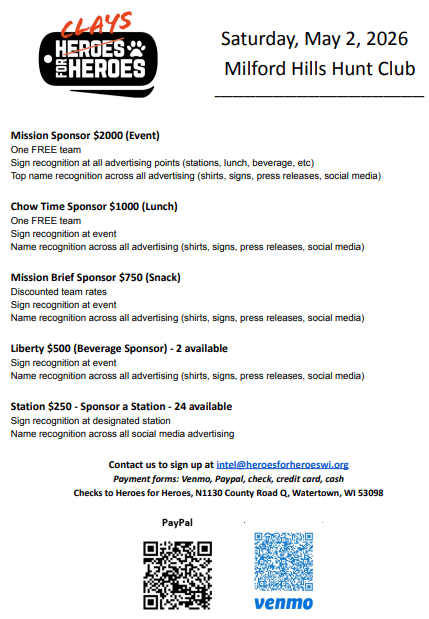 HEROES FOR HEROES is honored to announce the 4th Annual Clays for Heroes Sporting Clays Fundraiser, a community event dedicated to supporting our veterans and first responders and honoring the sacrifices they have made for our country.