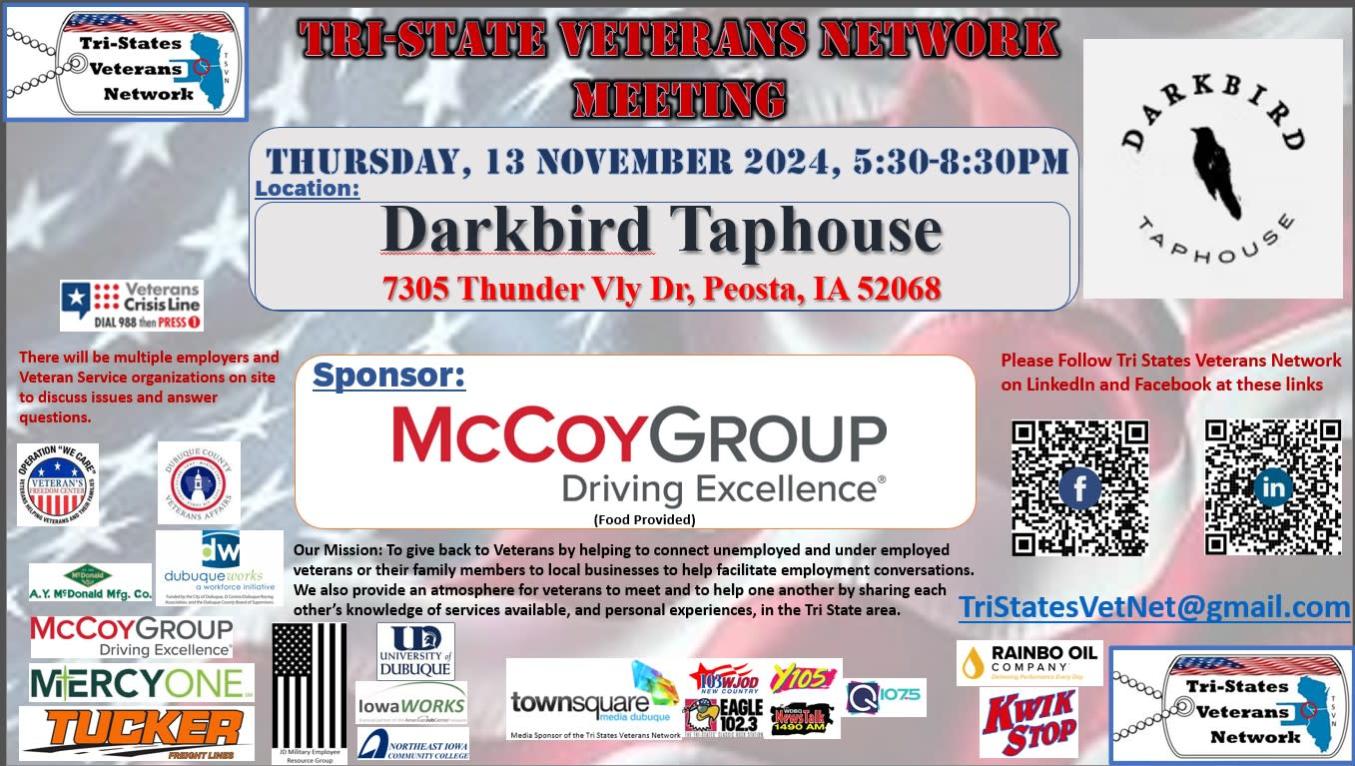 The Tri-States Veterans Network, an operation in Dubuque that is predicated on welcoming veterans and their families with open arms. Once a month, the network hosts casual meetings at local establishments around the area. These events are open to veterans and their families. The new venue each month provides a place to connect both with employers about employment opportunities and with fellow veterans to share knowledge about services and opportunities, The network would LOVE to collaborate more with VOB's in WI and Illinois!